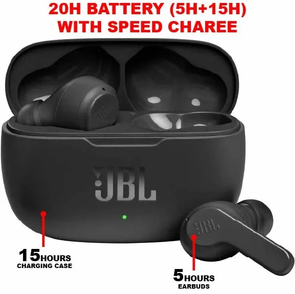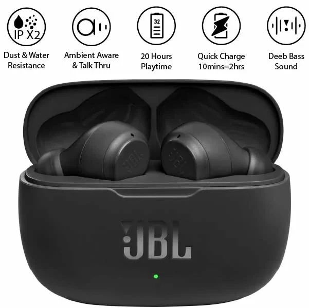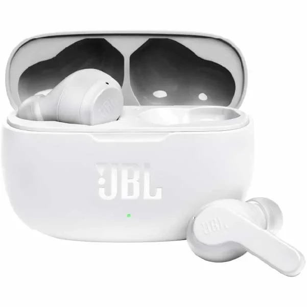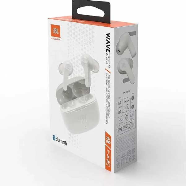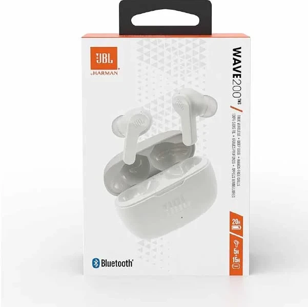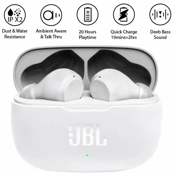 The JBL Wave 200TWS Wireless In-Ear Headphones offer powerful JBL Deep Bass Sound and Bluetooth 5.0 connectivity for an immersive audio experience. With an IPX2 water resistance rating, these headphones are splash-proof and perfect for everyday use. They have a convenient charging case, providing up to 20 hours of combined playback time. Enjoy seamless touch controls and hands-free calls with these sleek, in-ear headphones.