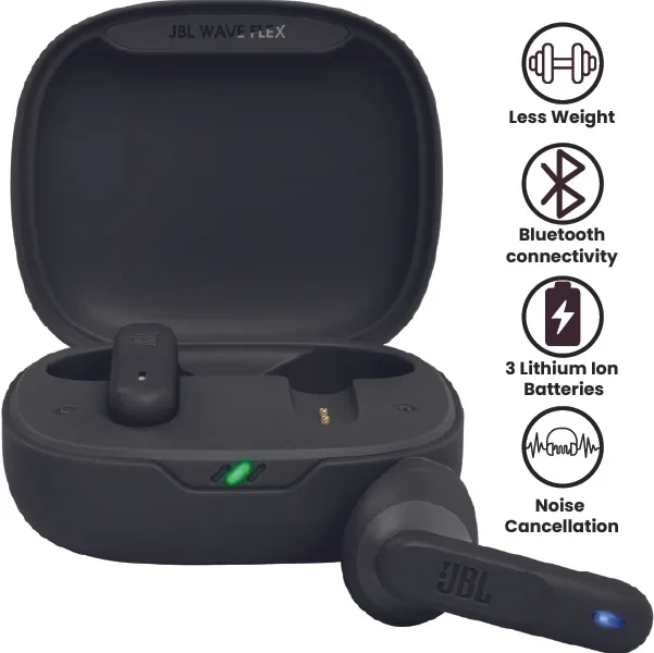 The JBL Wave Flex In-Ear Wireless Earphones deliver immersive sound with an 8mm dynamic driver and feature TalkThru and AmbientAware technology for clear conversations and awareness of your surroundings. With IP54 waterproofing for the earbuds and IPX2 for the case, they are resistant to water and dust, making them ideal for workouts or outdoor use. Enjoy up to 32 hours of total battery life, with a quick 10-minute charge providing 2 hours of playback. Stylish and functional, these black earphones are perfect for everyday use, delivering high-quality audio and convenient features in a compact design.