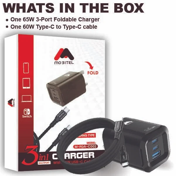 | Box Included | 1 x Mobitel 65W 3-in-1 Fast Charger, 1 x 60W Fast USB C-to-C Cable |