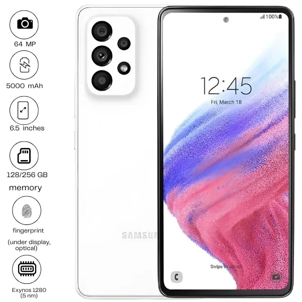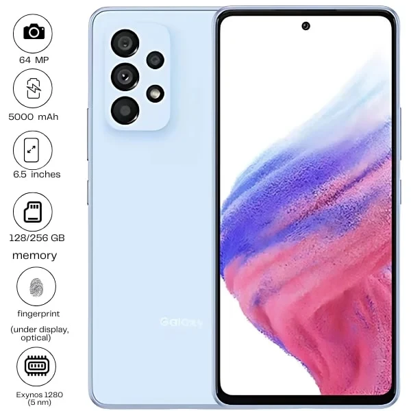 The Samsung Galaxy A53 5G features a 6.5" Super AMOLED display with a smooth 120Hz refresh rate. It has a powerful 64MP quad-camera setup and a 32MP front camera. Powered by a 5000mAh battery, it supports 25W fast charging. With 5G connectivity and a sleek design, it's a solid choice for everyday use.