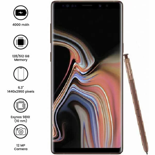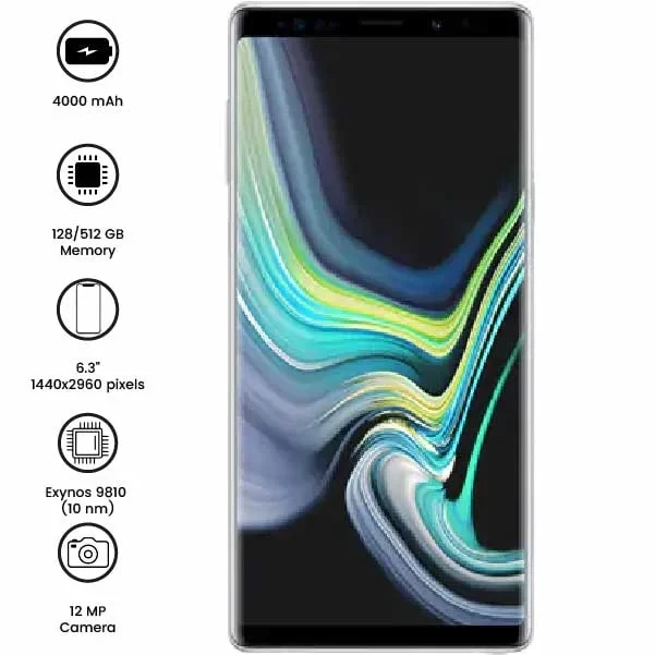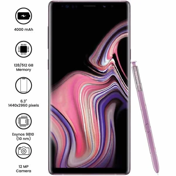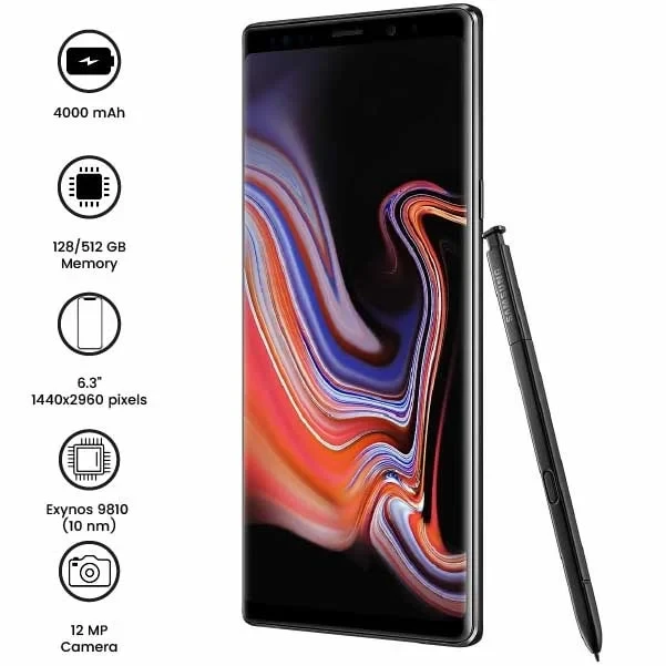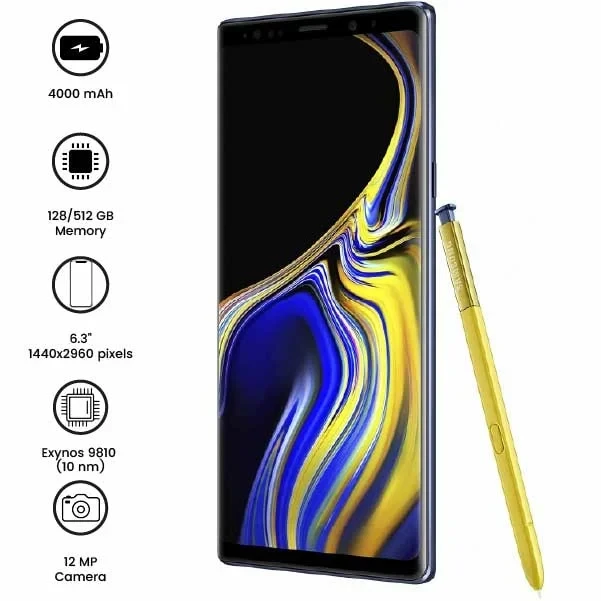 The Samsung Galaxy Note 9 features a 6.4-inch 1440x2960 pixel display for stunning visuals and a 12MP camera with 4K video recording. Powered by a 4000mAh battery with 15W wired and 5W wireless charging, it delivers reliable performance. Includes the iconic S Pen for enhanced productivity.