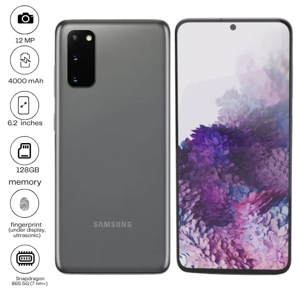 The Samsung Galaxy S20 5G features a 6.2-inch 1440x3200 pixel display for immersive visuals and a powerful 64MP camera with 8K video recording. It is equipped with a 4000mAh battery supporting 25W wired and 15W wireless charging. Experience smooth performance with 5G connectivity.