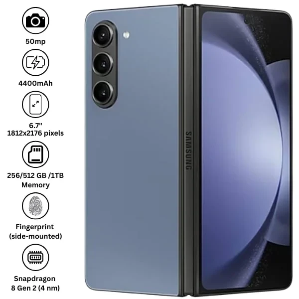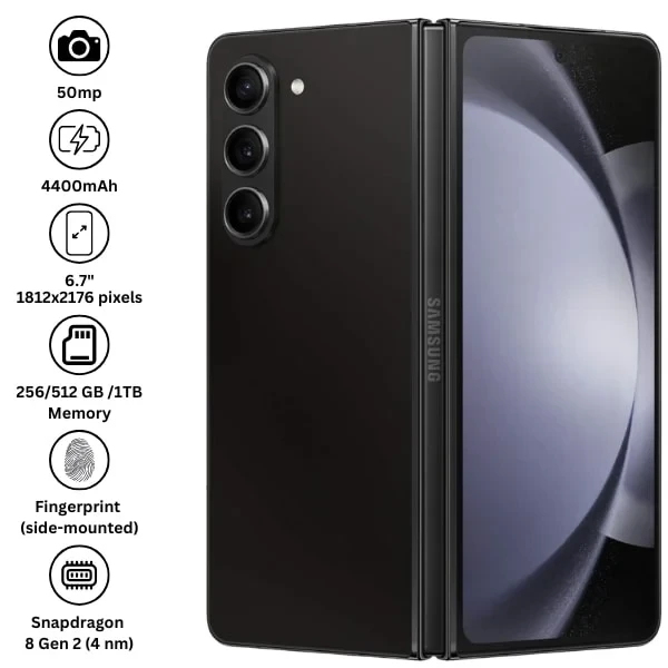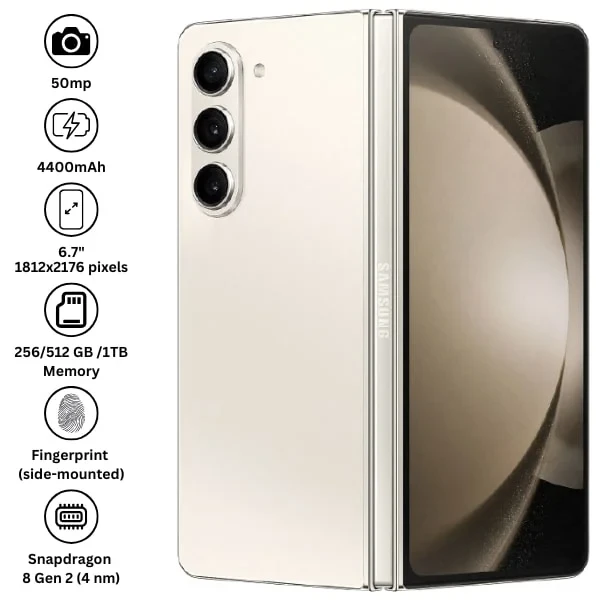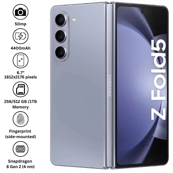 The Samsung Galaxy Z Fold5 features a 7.6" foldable AMOLED display with a resolution of 1812x2176 pixels. It sports a powerful 50MP camera capable of 8K video recording at 4320p. Equipped with a 4400mAh battery, it supports 25W fast charging and 15W wireless charging, making it a premium multitasking powerhouse.