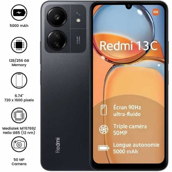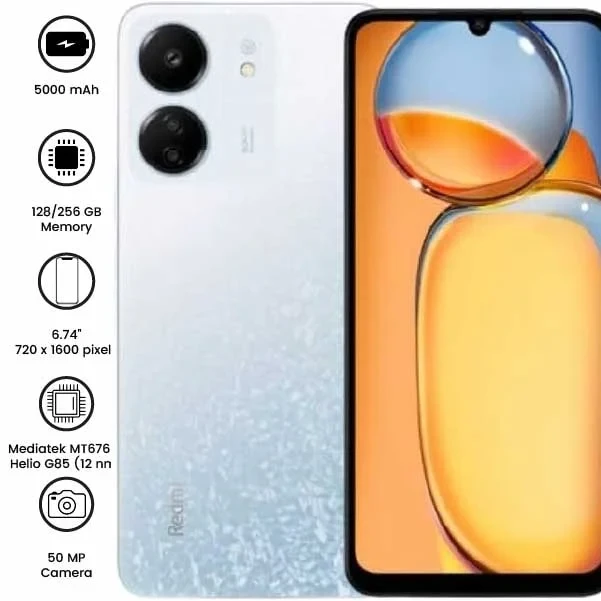 The Xiaomi Redmi 13C offers a 6.74" HD+ display (720x1600 pixels) and a 50MP rear camera for high-quality photos and 1080p video recording. With a 5000mAh battery and 18W fast charging, it ensures long-lasting performance and quick power-ups. Perfect for everyday use with reliable multitasking capabilities.